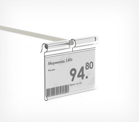 Крепится на Т-образные одинарные и двойные металлические крючки. Откидывается вверх при снятии товара с крючка. Высота держателя - 26, 39, 52, и 60 мм.