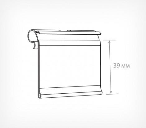 Подвешивается на T-образные одинарные или двойные  металлические крючки. При снимании товара с крючка откидывается вверх, затем  возвращается в исходное положение. Высота ценникодержателя 39 мм.