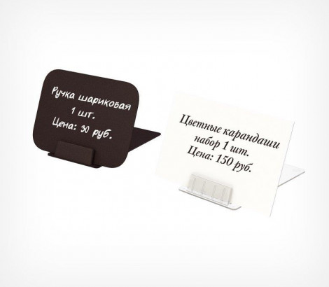 Держатель - подставка для ценника, таблички. Позволяет размещать ценники и таблички для надписи маркером, под углом 75° и 90° к поверхности размещения. Фиксирует вставки толщиной до 0,8 мм. Противоскользящие ножки.