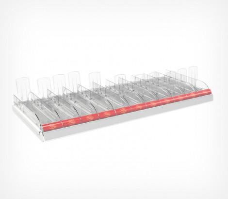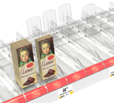 Набор из 11 лотков для выкладки плиточного шоколада. Поставляется в собранном виде, благодаря этому установка на полку занимает за считанные секунды. В набор включены цветные вставки во фронт для организации сегментации на полке по типам шоколада. Для полки шириной 1000 мм.