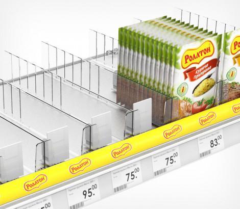 Используется передний профиль с ценникодержателем. Высота рекламной вставки - 30 мм. Имеет Т-профиль для крепления разделителей и толкателей. Крепится на полку на двухсторонний скотч.