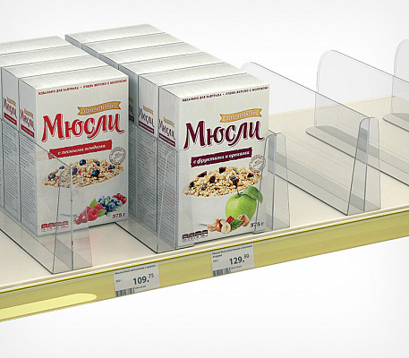 Универсальный разделитель высотой 150 мм с передним ограничителем на всю высоту разделителя, предотвращающим падение товара с полки. Применяется для выкладки и организации крупногабаритных товаров. Конструкция обеспечивает простоту применения.