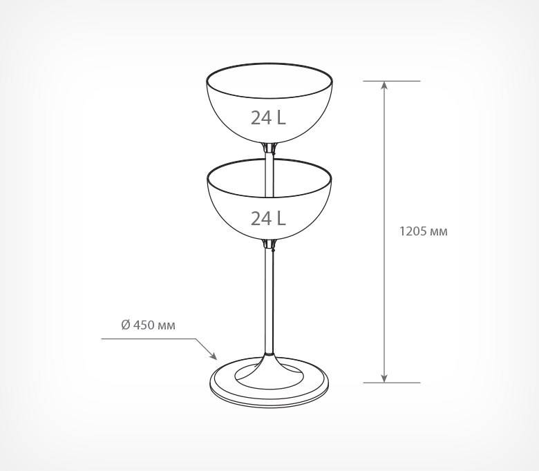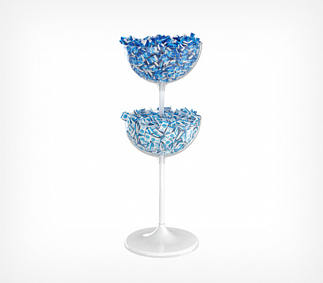 Двухуровневый дисплей UNIBOWL-TOWER-24 предназначен для выкладки продовольственных и непродовольственных товаров в компактной упаковке. Особенности модели: Габаритные размеры: высота — 1205 мм, диаметр основания — 450 мм. Количество чаш: 2. Объём: 24+24 л. Материал: пластик, металл. Цвет основания: белый. Дисплей состоит из нескольких частей, которые легко собираются между собой без использования инструмента: пластиковое основание, две трубы длиной 520 и 410 мм, пластиковые прозрачные чаши объёмом 24 литра, заглушка, защищающая полость трубы. Может использоваться с дополнительными опциями: информационной рамкой, ценниками, разделителями внутреннего пространства чаш, которые приобретаются отдельно.