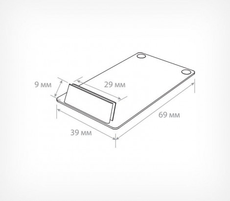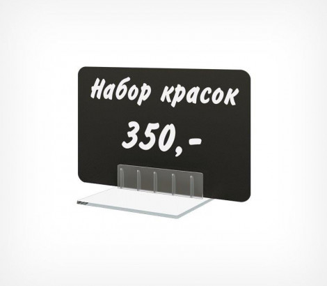 Держатель - подставка для ценника, таблички. Позволяет размещать ценники и таблички для надписи маркером, под углом 75° и 90° к поверхности размещения. Фиксирует вставки толщиной до 0,8 мм. Противоскользящие ножки.