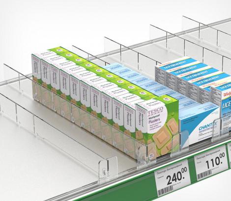 Разделитель DIV60-BT60 выс.60 мм с передним огран.60 мм — пластиковый разделитель с передним ограничителем. Имеет насечки с шагом 25 мм для обламывания по длине, материал: прозрачный ударопрочный пластик. Применение: для организации выкладки небольших лёгких товаров, таких как сигареты, лекарства, парфюмерия и косметика.