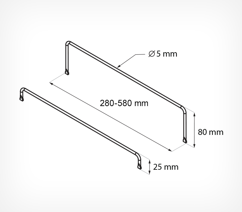 Необходим для разделения товаров на полке. Высота варьируется в зависимости от высоты товара. Высота разделителя должна быть не менее 1/3 от высоты продукта. Если полка является крайней, то для предотвращения падения продуктов используется высокий разделитель с этого края. Стандарты высот: 25 и 80 мм.
