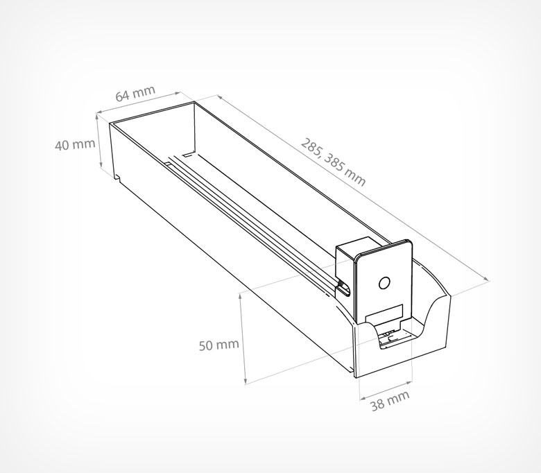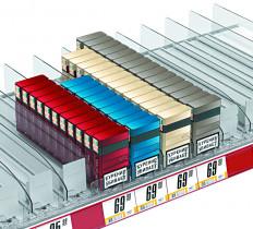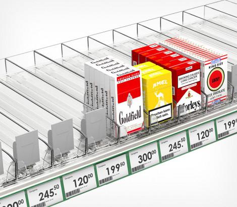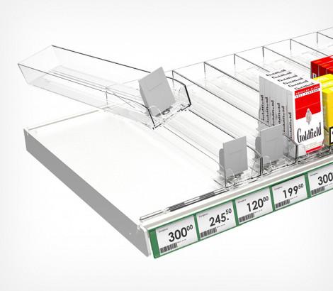 Сигаретные лотки очень просты в применении - нет необходимости выставлять нужную ширину между стенками и крепить толкатель. Достаточно просто защёлкнуть лоток на крепёжных профилях, и им можно пользоваться! Подойдёт для любой продукции, сходной по габаритам с пачкой сигарет.