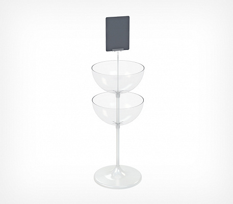 Двухуровневый дисплей UNIBOWL-TOWER-24 предназначен для выкладки продовольственных и непродовольственных товаров в компактной упаковке. Особенности модели: Габаритные размеры: высота — 1205 мм, диаметр основания — 450 мм. Количество чаш: 2. Объём: 24+24 л. Материал: пластик, металл. Цвет основания: белый. Дисплей состоит из нескольких частей, которые легко собираются между собой без использования инструмента: пластиковое основание, две трубы длиной 520 и 410 мм, пластиковые прозрачные чаши объёмом 24 литра, заглушка, защищающая полость трубы. Может использоваться с дополнительными опциями: информационной рамкой, ценниками, разделителями внутреннего пространства чаш, которые приобретаются отдельно.